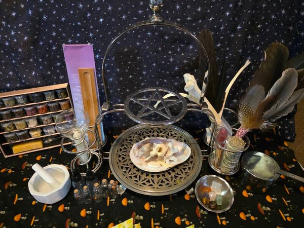 This is an all inclusive altar setup! Based with a gorgeous vintage Silvertone altar with a large pentacle in the top and a silver offering tray on bottom. Each side has 2 accessories holders 3 have a silver tray in the bottom and one has a candle holder attached. Very sturdy and easily portable, while remaining sleek and polished looking. Everything you need to get started with the craft!